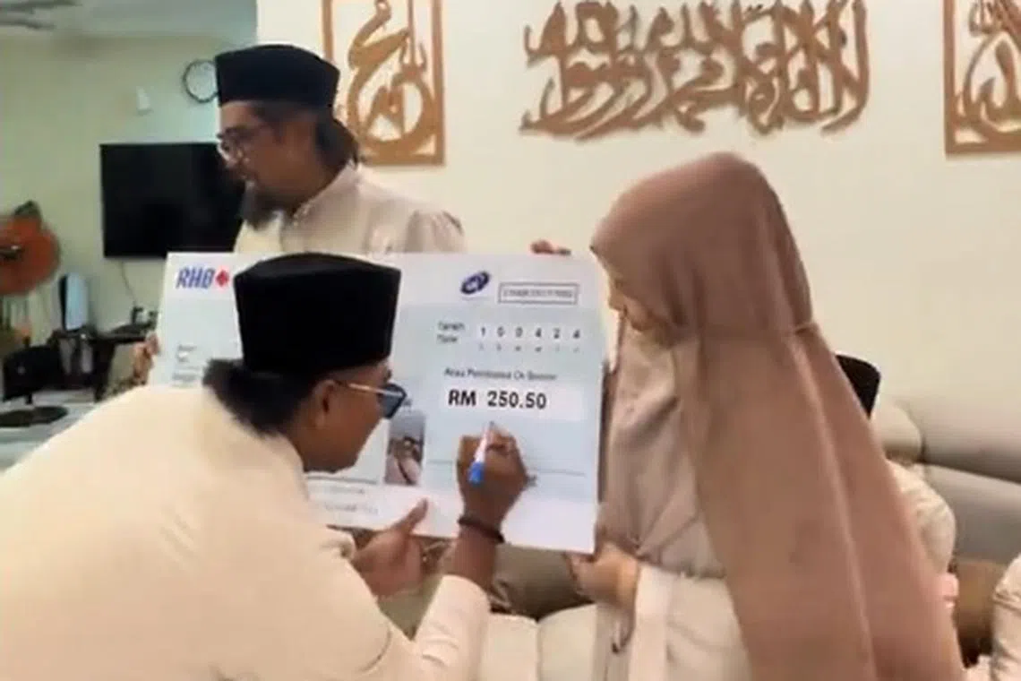 Gelagat yang dirakam memaparkan apa yang difahamkan sebagai anak-beranak memberi duit raya dalam bentuk ‘Mock Cheque’ atau cek tiruan yang seringkali digunakan dalam upacara pemberian hadiah.