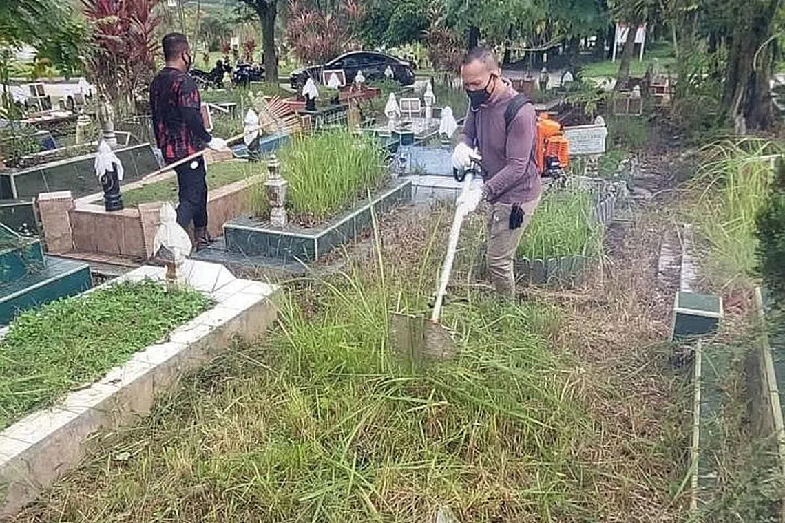 SATU BENTUK SUMBANGAN: Encik Ramli (kanan) bersama anggota Reforming Support Group lain membersihkan tanah perkuburan di Pusara Abadi baru-baru ini. - Foto ihsan RAMLI ABDULLAH -