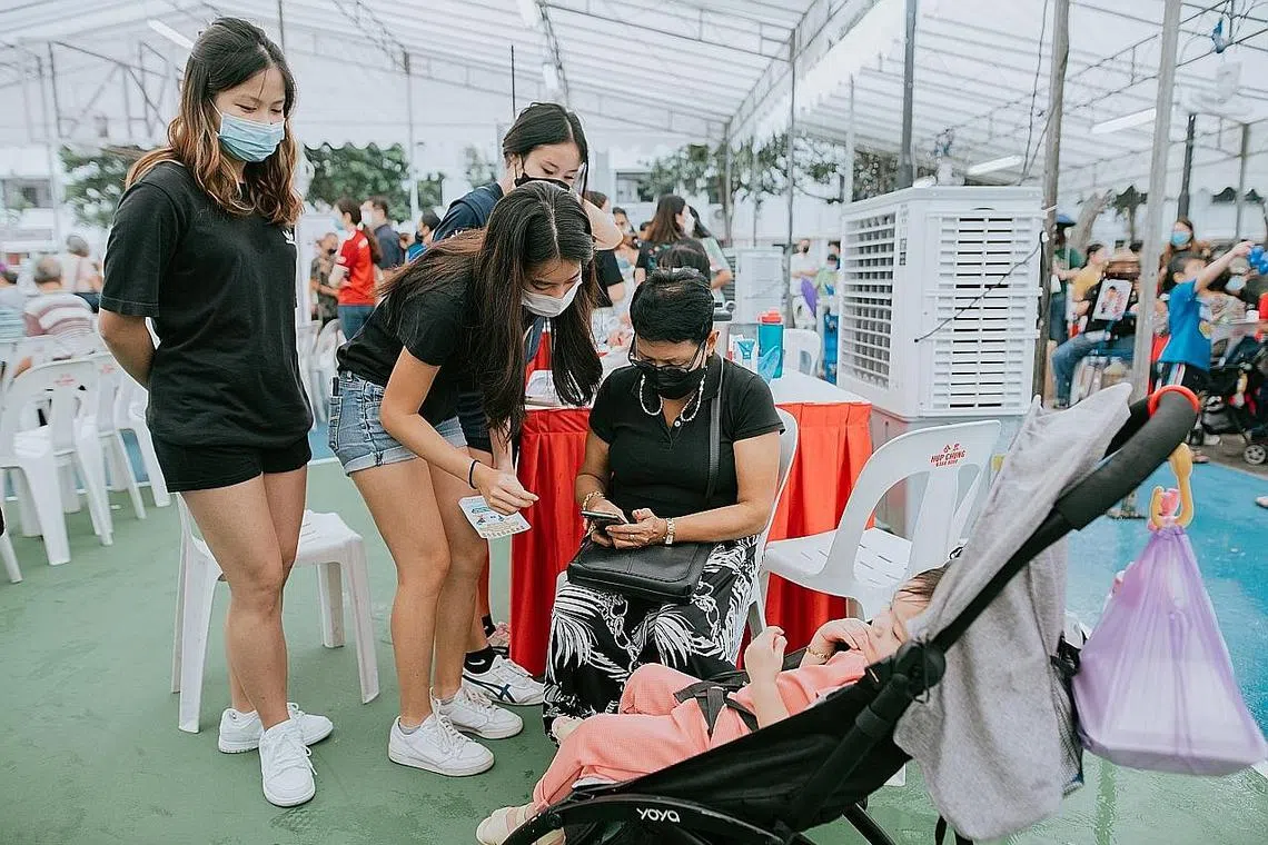 PELANCARAN APLIKASI: Para relawan sedang beri panduan dan mengajar cara menggunakan aplikasi MacPherson Cares. - Foto MACPHERSON CONSTITUENCY OFFICE -