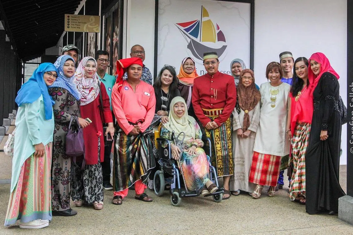 MEMPERAGA BUSANA BUGIS: Orang Bugis Singapura masih berbangga menggayakan busana Bugis di khalayak ramai semasa mengunjungi pameran 'Sirri Na Pesse: Menelusuri Identiti Masyarakat Bugis di Singapura' dari 14 Oktober 2017 hingga 24 Jun 2018. Saya pula (berdiri di tengah) mengenakan baju berwarna merah pekat, berkain dam bersongkok pakaian di sebelah mantan Wanita Pertama Singapura, Puan Noor Aishah, yang turut menyaksikan pameran itu di Taman Warisan Singapura. - Foto ihsan SARAFIAN SALLEH -