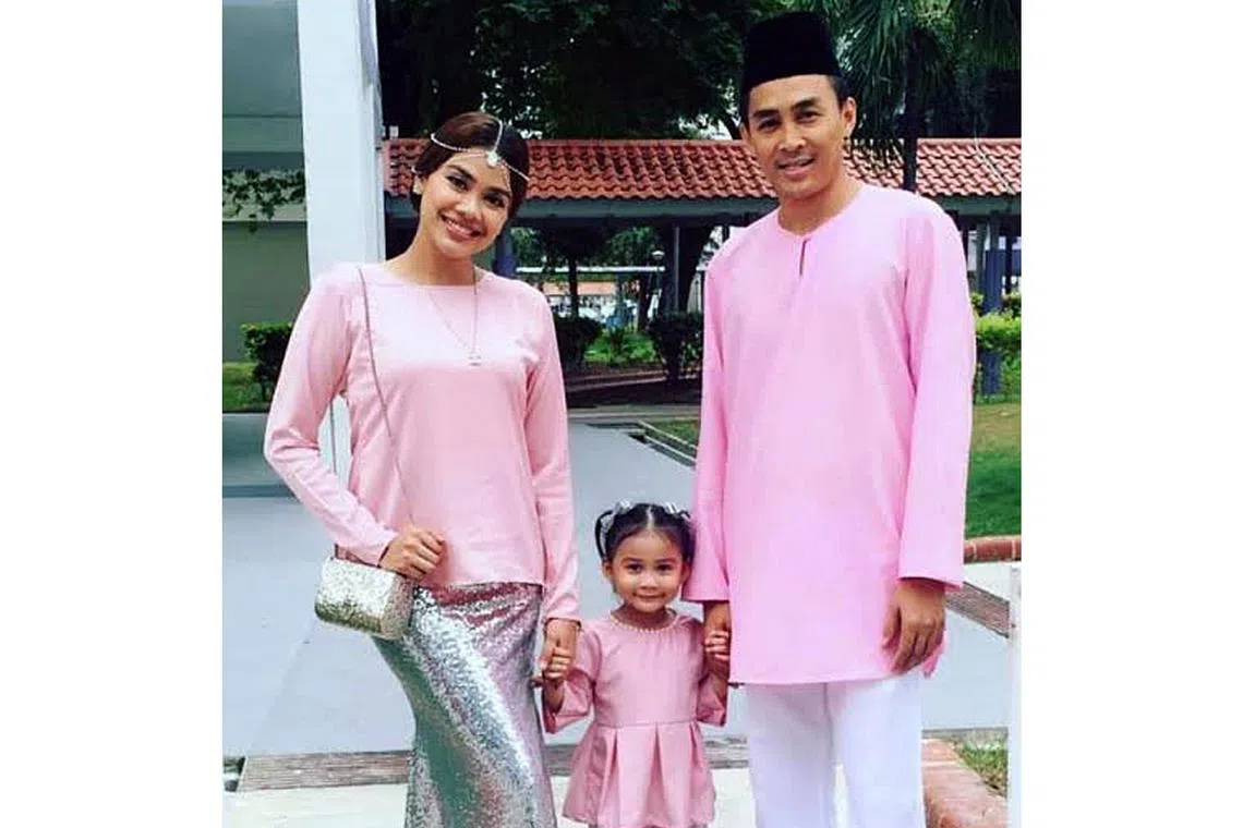 SIBUK BERAYA: Huda Ali bersama suami, Den Sabari, dan anak mereka, Leia Qaseh, biasa beraya sehingga tengah malam pada Hari Raya pertama. Pada malam Raya, mereka sekeluarga berbuka puasa dengan menikmati lauk-pauk Raya di rumah orang tua Huda di Yishun. - Foto ihsan HUDA ALI -
