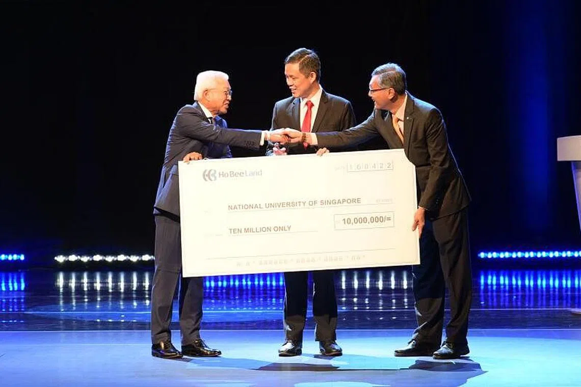 Pengasas dan Pengerusi Ho Bee Land Limited, Dr Chua Thian Poh (kanan), Encik Chan (tengah) dan presiden NUS Profesor Tan Eng Chye di pelancaran Teach Singapore pada 16 April. - - Foto BH oleh NG SOR LUAN