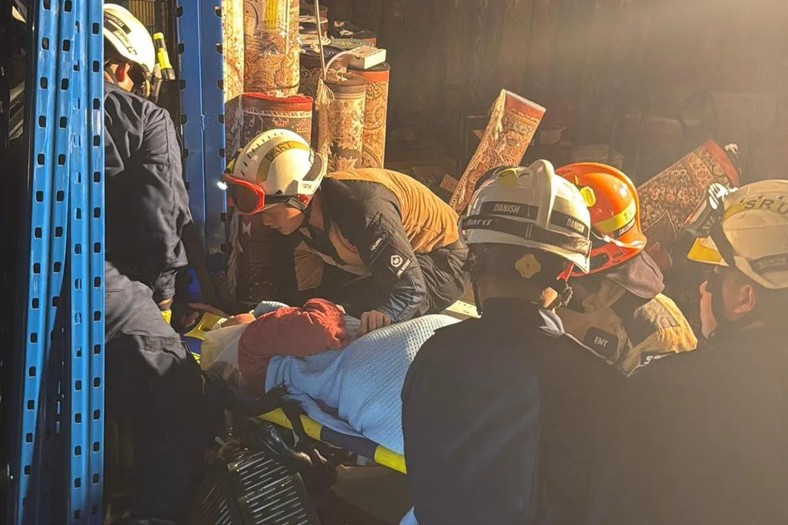 Selepas kira-kira 90 minit, pasukan penyelamat berjaya mengalihkan gulungan permaidani serta memotong rak-rak di tempat itu dan menemui mangsa.