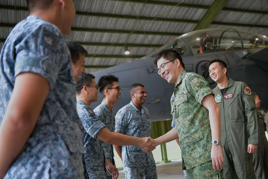 SEDIA LAPORKAN DIRI: Panglima Pasukan Pertahanan Leftenan Jeneral Melvyn Ong (dua dari kanan) bertemu anggota Perkhidmatan Negara (NSmen) aktif dan kerahan daripada skuadron 142 dan 19 Angkatan Udara Republik Singapura (RSAF) di Pangkalan Udara Paya Lebar semalam. - Foto BH oleh KUA CHEE SIONG -