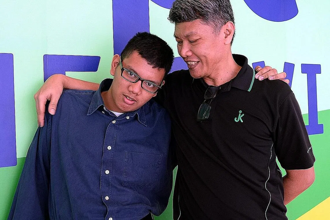 BINA TAHAP KEYAKINAN: Dengan bantuan guru di sekolah, Encik Muhd Aqram Mohd Yazed (kiri) dapat membina tahap keyakinan dirinya dan kini tidak berasa gementar berdiri di hadapan orang ramai sebagai pengacara. Bersamanya ialah bapa beliau, Encik Mohd Yazed M Affandee. -