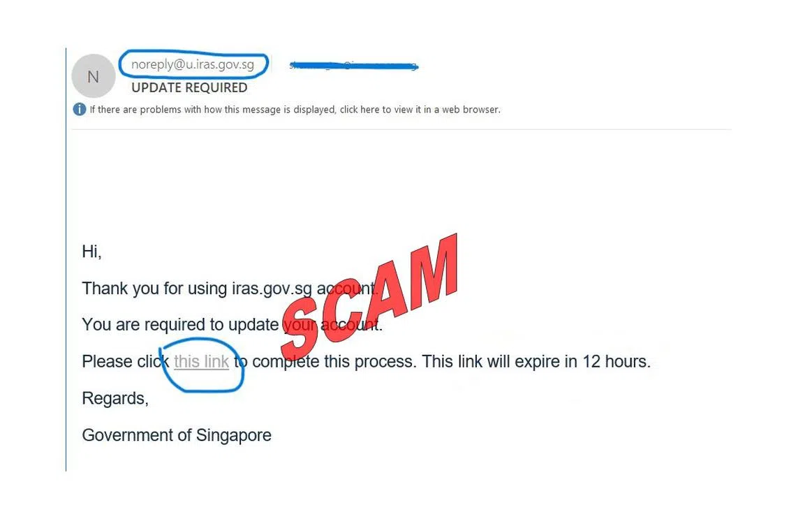 E-mel sah dari Iras akan berakhir dengan alamat @iras.gov.sg dan penguasa itu tidak akan meminta maklumat berahsia, termasuk kata laluan, kata laluan sekali (OTP) SingPass, kad kredit dan butiran akaun bank, menerusi e-mel atau pautan web yang tidak dijamin selamat, menurut Iras dalam lamannya.