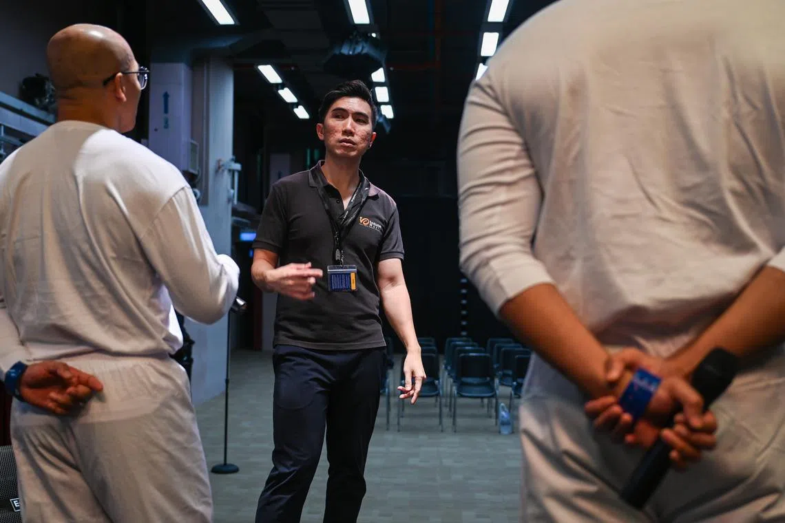 Noor (kiri) dan Hafiz (kanan), bukan nama sebenar, bersama jurulatih muzik mereka, Encik Aaron Lim, yang juga Pengarah Intune Music, membuat persiapan bagi persembahan Konsert Ulang Tahun ke-20 Projek Reben Kuning (YRP) di Kompleks Penjara Changi pada 30 September. - Foto BH oleh SHAFIQ APANDI