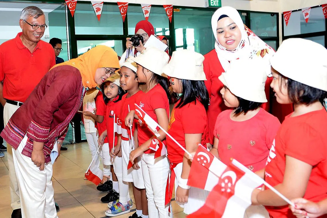 Sambut Hari Kebangsaan bersama penduduk di Pasir Ris : Cik Halimah Yacob, yang diiringi Pengarah Eksekutif Angkatan Karyawan Islam (AMP), Encik Mohd Anuar Yusop, menghadiri sambutan Hari Kebangsaan di Kelab Masyarakat Pasir Ris East semalam. Cik Halimah antara lain bertemu dengan kanak-kanak daripada Tadika Kidz Meadow MERCU Learning Point di majlis itu yang dimeriahkan lagi dengan karnival permainan, kegiatan dan makanan. - Foto KHALID BABA -