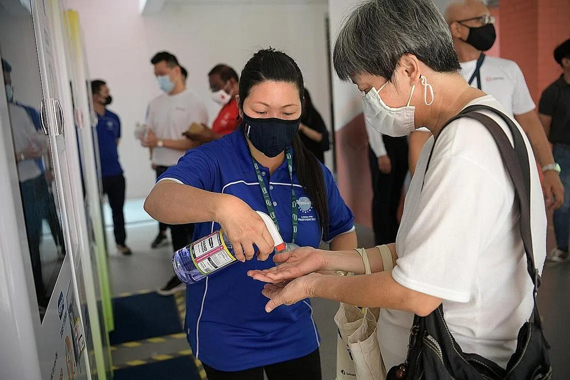 SUKARELAWAN membantu penduduk mengambil sanitiser tangan percuma di Kelab Masyarakat Yew Tee semalam, pada hari pertama pengagihan yang dijalankan oleh Yayasan Temasek itu.