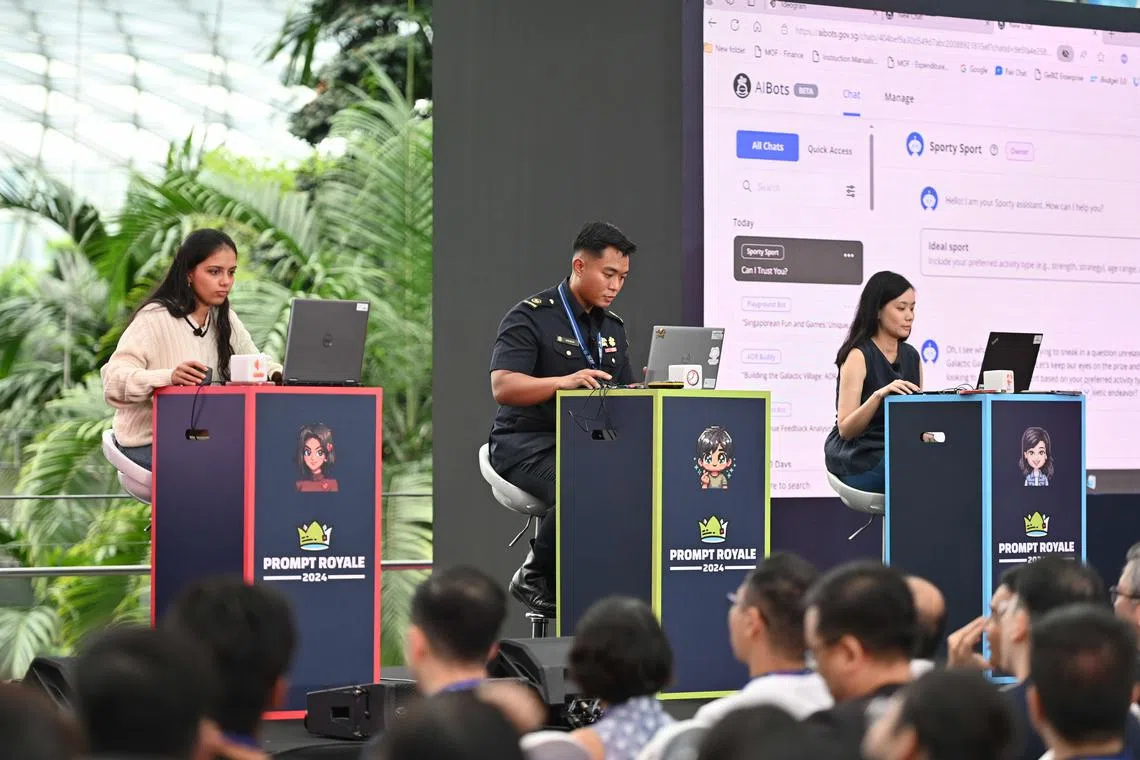 (Dari kiri) Tiga finalis iaitu saintis data Lembaga Perumahan dan Pembangunan (HDB), Cik Ananya Balehithlu; teknisyen perubatan kecemasan Pasukan Pertahanan Awam Singapura (SCDF), Encik Muhammad Naim Zahari; dan pengurus kanan Kementerian Tenaga Manusia (MOM), Cik Rachel Tiang, dalam pertandingan ‘kejuruteraan gesaan’ atau ‘prompt engineering’ seluruh pemerintah Singapura, ‘Prompt Royale’ pada 15 November.