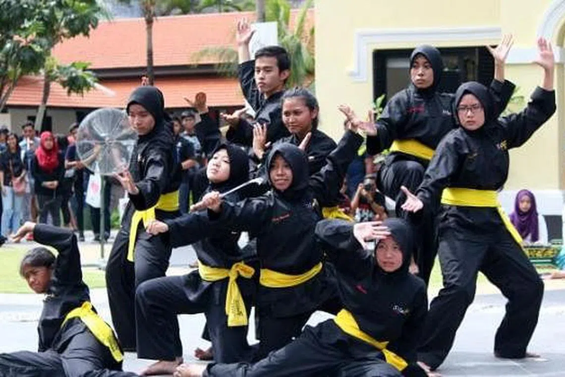 PERTUNJUKAN PENCAK SILAT: Aksi tangkas dalam persembahan silat daripada pelajar pengajian tinggi memukau tumpuan penonton yang hadir di acara Rentak Budaya yang diadakan di Taman Warisan Melayu, Sabtu lalu. Hadirin turut berpeluang menyertai silat tanding yang dibuka kepada orang ramai. - Foto-foto ihsan SHAFIQAH WALID (NTU MLCS) -