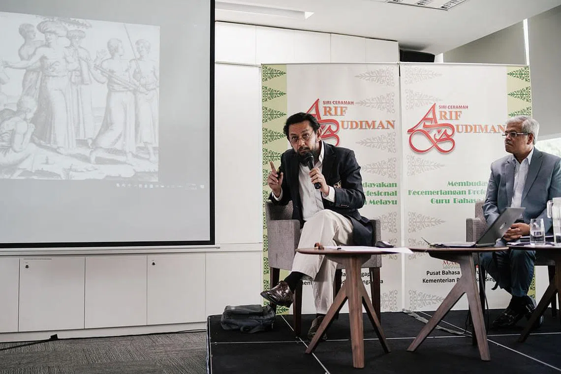 SESI SOAL JAWAB: Penyampai ucaptama 'Ceramah Arif Budiman', Profesor Madya Farish Ahmad Noor (kiri), bersama pengarah Pusat Bahasa Melayu Singapura (MLCS), Encik Mohamed Noh Daipi, memberi jawapan dalam sesi soal jawab dengan peserta di MLCS, Bishan Street 14, semalam. - Foto BH oleh ONG WEE KIAT -