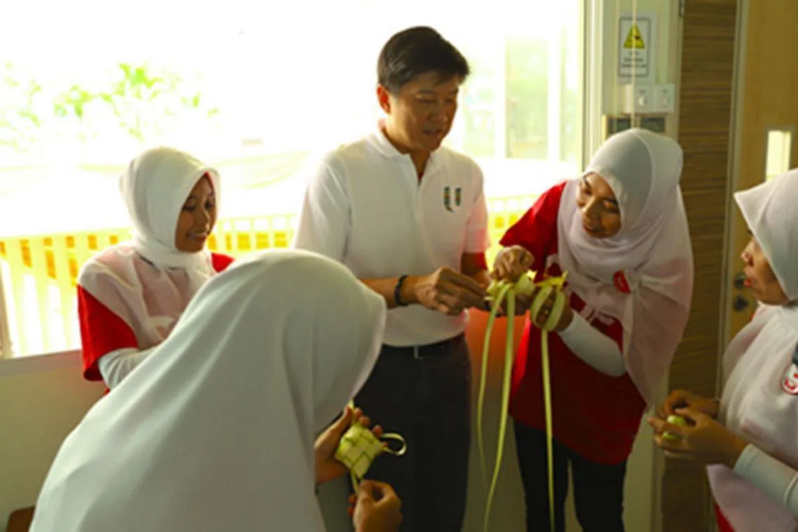 PAYAH TETAPI SERONOK: Encik Ng Chee Meng menyertai satu sesi bersama para relawan Pusat Pekerja Domestik baru-baru ini untuk belajar cara menganyam kelongsong ketupat. - Foto NTUC -