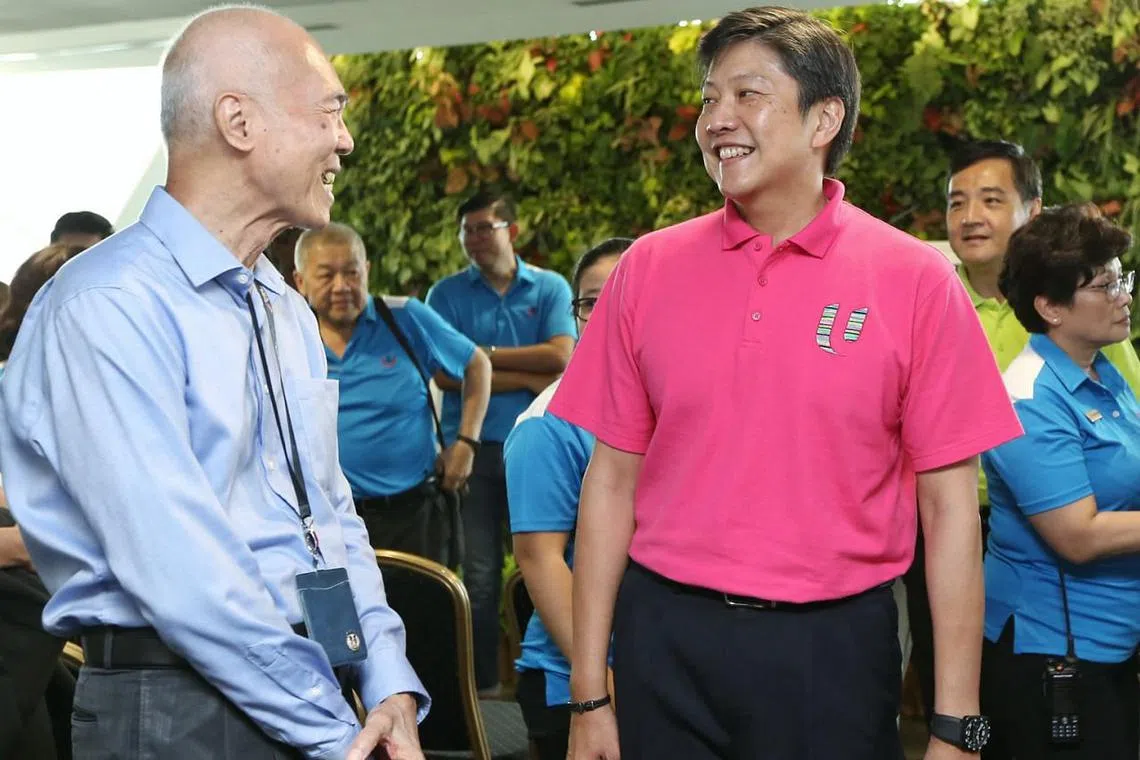 HARGAI PEKERJA BERUSIA: Encik Ng Chee Meng (berbaju merah jambu) memuji usaha Taman Di Persisiran di Marina yang kini mempunyai 20 pekerja yang berusia lebih 60 tahun. - Foto ZAOBAO -
