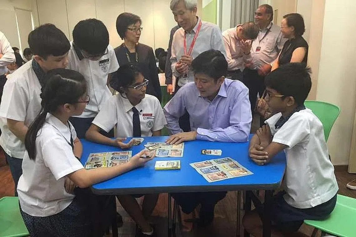 BERMAIN KAD: Encik Ng Chee Meng (duduk, berbaju ungu) mencuba permainan kad, SG Unite!, dengan pelajar darjah enam daripada Sekolah Rendah St Hilda's. - Foto THE STRAITS TIMES -