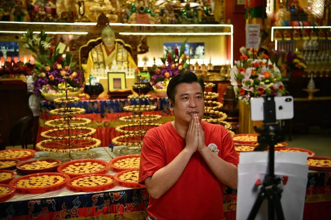 KEBELAKANGAN ini, penganut agama Buddha, seperti agama lain di Singapura, telah menyesuaikan cara mereka melakukan persembahan keagamaan, seperti sesi bertakafur dan amalan sembahyang secara dalam talian sedang pemerintah melarang perhimpunan agama di tempat menunaikan ibadah bagi menyekat penyebaran koroavirus di sini.