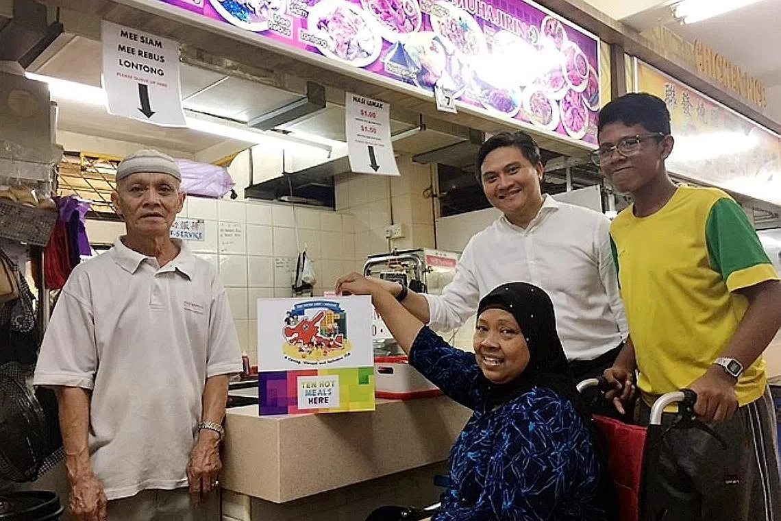 MEMBANGKIT 'SEMANGAT KAMPUNG': (Dari kiri) Encik Mohd Tahir Omar, pemilik kedai makan Muhajirin, merupakan antara pegerai makanan yang menyokong usaha program baru membantu memberi makanan percuma kepada penduduk seperti Cik Rubiah Hussein dan cucunya, Nazarul Faiq (kanan). Bersama mereka ialah AP GRC Bishan-Toa Payoh, Encik Saktiandi Supaat. - Foto FAKHRURADZI ISMAIL -