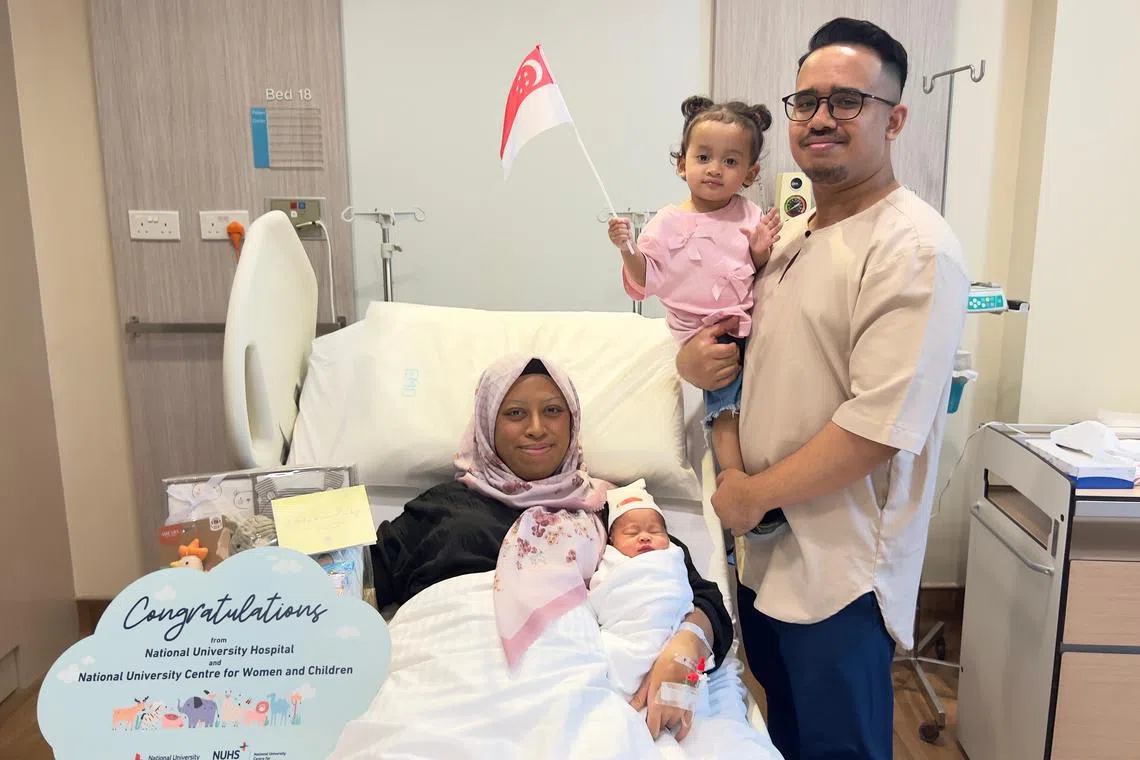 Cik Siti Aisyah, 30 tahun, selamat melahirkan anak perempuan seberat 3.246 kilogram di Hospital Universiti Nasional (NUH), menjadikan anak pasangan tersebut antara bayi pertama dilahirkan di NUH sempena Hari Kebangsaan Singapura ke-60.
