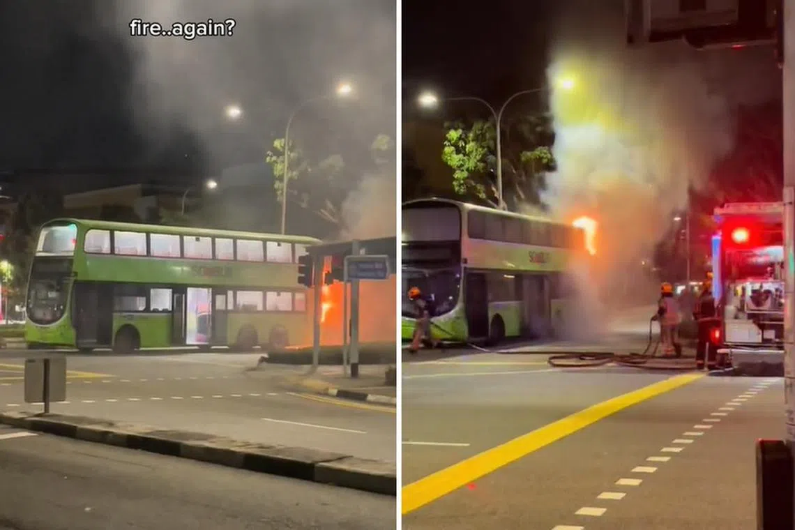 Dalam sebuah video yang disiarkan di TikTok pada Selasa, sebuah bas dua tingkat yang berhenti di simpang Tampines Avenue 4 dan Tampines Avenue 3 kelihatan terbakar di bahagian belakangnya.