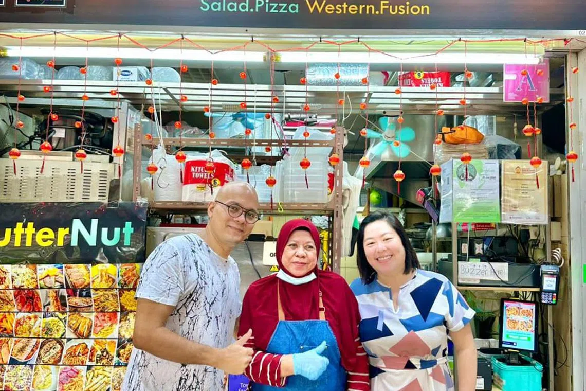 USAHA DIIKTIRAF: Kededua pengasas ButterNut, Cik Vivian Liem (kanan) dan suaminya, Encik Daren Lionel Oliveiro, merupakan pemenang Anugerah Penjaja Berdaya Usaha di Anugerah Penjaja Singapura 2023. Bersama mereka ialah Cik Siti Banun (tengah), pekerja paling lama di gerai tersebut. - Foto FMAS