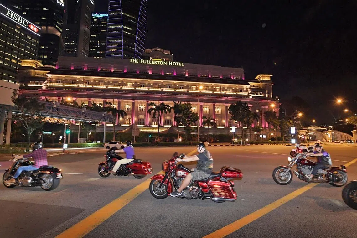 SEKUMPULAN 30 penunggang motosikal Harley-Davidson telah melalui kawasan bandar semalam sementara beberapa bangunan di kawasan tersebut dinyalakan lampu berwarna ungu (gambar atas).