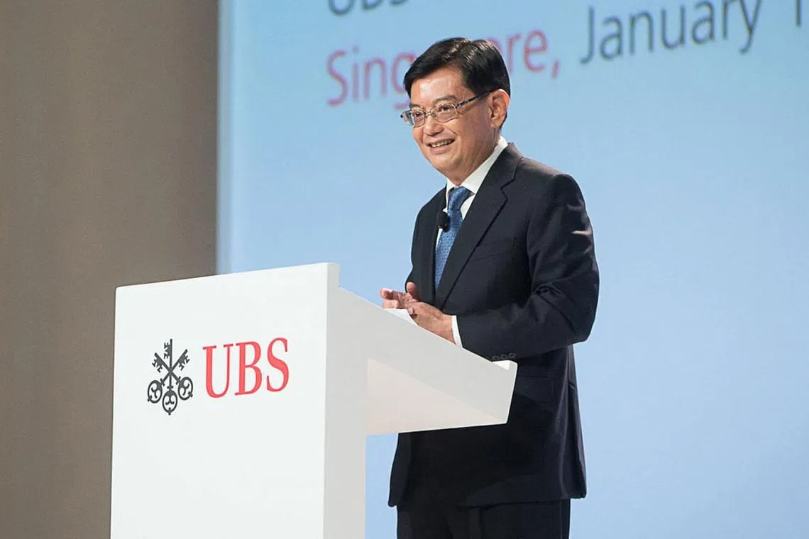 UMUMKAN GERAN: Encik Heng Swee Keat berucap di persidangan pengamatan harta UBS di Pusat Konvensyen dan Expo Marina Bay Sands pagi semalam. Beliau turut mengumumkan geran baru yang dipanggil Pasaran Ekuiti Singapura (Gems). - Foto UBS -