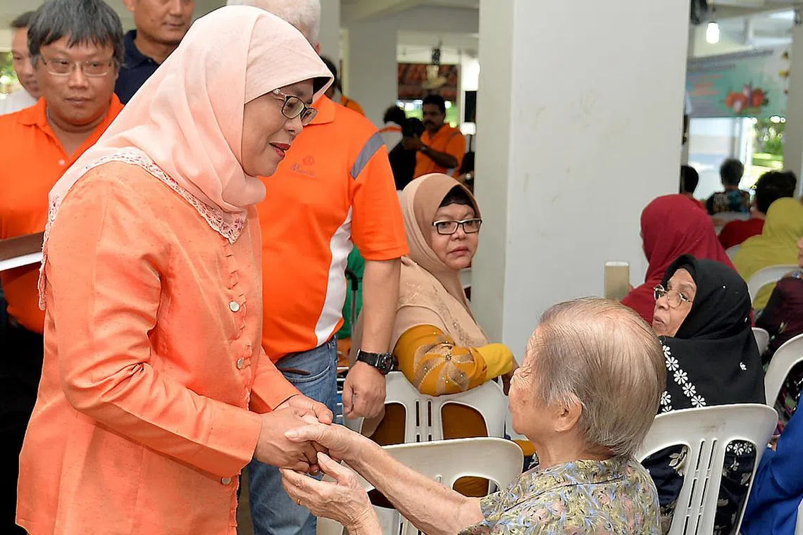 BERSALAMAN: Cik Halimah (kiri) bersalaman dengan seorang penduduk semasa hadir di acara akar umbi di Marsiling semalam. - Foto M.O. SALLEH -