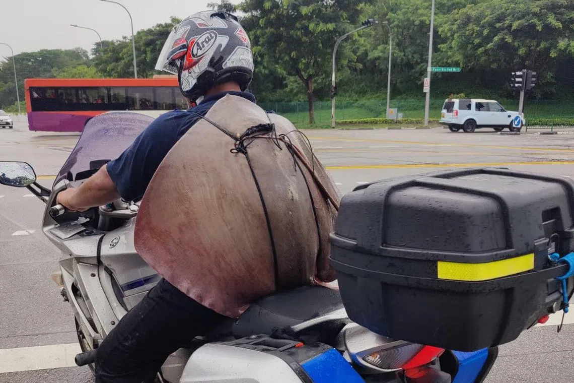 Dari Pasir Ris hingga Jurong West, seorang penunggang motosikal dilihat membawa ikan pari hasil tangkapannya bak beg galas.