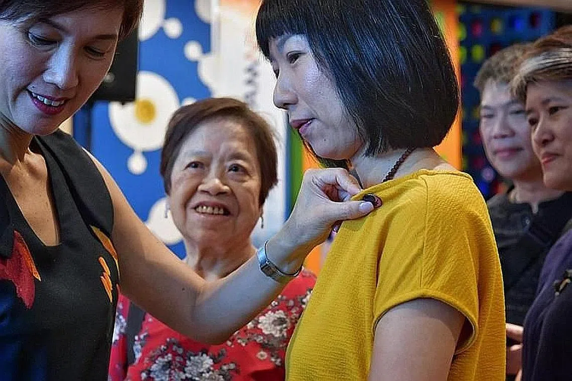 IKTIRAF SUMBANGAN ISTERI DAN IBU ANGGOTA NS: Cik Teo (kiri) meletakkan pin kolar di blaus suri rumah, Cik Jenny Sim, semasa di acara pelancaran inisiatif 'Everyday (Her)oes' semalam. - Foto BH oleh NG SOR LUAN -