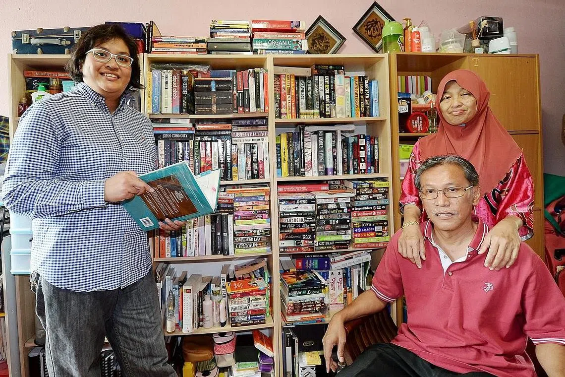 TANAM MINAT SUKA MEMBACA: Encik Suhaiemi Sakon dan Cik Khalijah Hassan (kanan) membiasakan anak dengan buku sejak kecil. Tabiat membaca membolehkan kesemua anak mereka, termasuk Cik Tuty Norashikin (kiri), mencapai kejayaan cemerlang dalam pelajaran. - Foto ZAINAL YAHYA. -