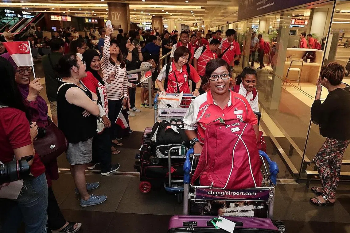 WIRA NEGARA: Atlit memanah wanita negara, Nur Syahidah Alim (depan), selamat pulang ke tanah air bersama kontinjen negara yang bertanding di APG di Jakarta dengan disambut meriah oleh anggota keluarga dan penyokong di Terminal 2 Lapangan Terbang Changi semalam. - Foto BH oleh KELVIN CHNG -