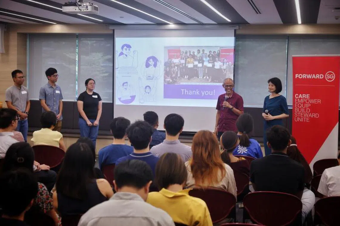 DEMI PERBAIKI MASYARAKAT: Menteri Negara (Pembangunan Sosial dan Keluarga) Cik Sun Xueling (kanan), dan Menteri Pembangunan Sosial dan Keluarga, Encik Masagos Zulkifli Masagos Mohamad (kiri), telah menerima cadangan daripada mahasiswa Universiti Nasional Singapura (NUS). - Foto ST