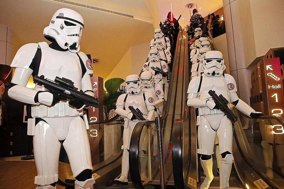 STORM TROOPERS: Watak daripada filem 'Star Wars' ini membuat penampilan ketika tayangan perdana 'Star Wars: The Force Awakens' dua tahun lalu di Shaw Lido. Mereka berkemungkinan hadir lagi pada Pesta Star Wars yang akan berlangsung bulan depan. - Foto fail THE STRAITS TIMES -