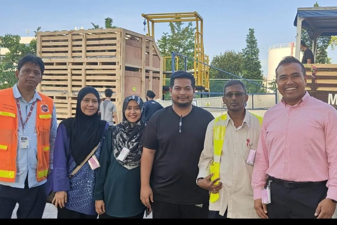 (Dari kiri) Pengurus Hab Udara e-dagang Sats, Encik Mohamed Raffi Abdul Majid; Pengasas Aliyah Rizq Holdings Pte Ltd (ARH), Cik Siti Alawiyah; Ketua Pegawai Kewangan (CFO) ARH, Cik Nabilah Bagarib; Ketua Pegawai Eksekutif (CEO) ARH, Encik Mohamad Nor Ashraf Abu Bakar; Ketua Pegawai Operasi (COO) ARH, Encik Feisal Marican; bersama Anggota Parlimen GRC Pasir Ris-Punggol, Encik Sharael Taha yang merasmikan acara ketibaan kambing-kambing korban ke Singapura di Kompleks Kargo Changi pada Jun 2023. - Foto ihsan MOHAMAD NOR ASHRAF ABU BAKAR
