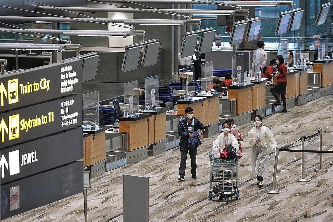 BEBERAPA orang dengan pakaian peralatan perlindungan peribadi (PPE) penuh dilihat di kaunter check-in di Terminal 3 Lapangan Terbang Changi semalam.