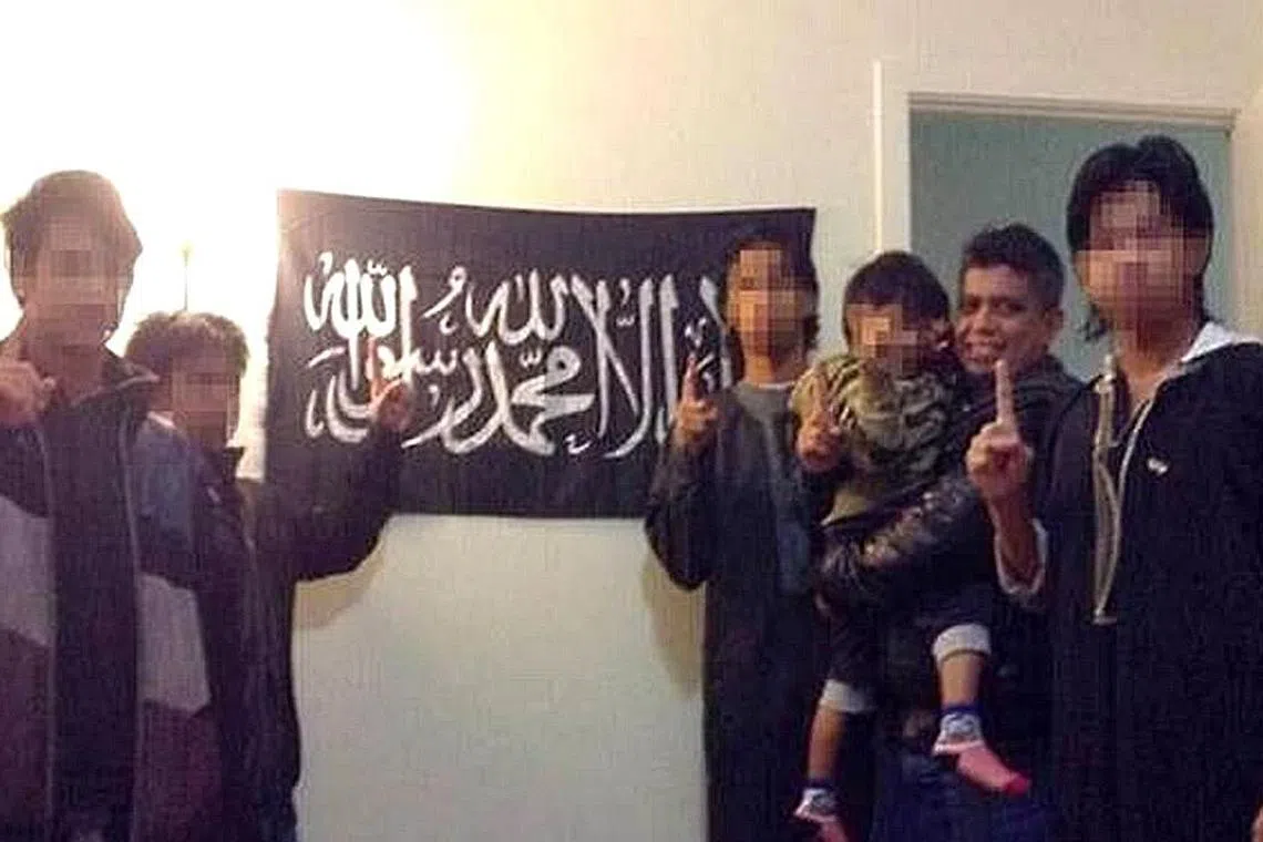 JADI RADIKAL: Zulfikar (dua dari kanan) memuatnaik fotonya bersama anak-anaknya di depan bendera kumpulan pengganas. - Foto fail KEMENTERIAN EHWAL DALAM NEGERI -