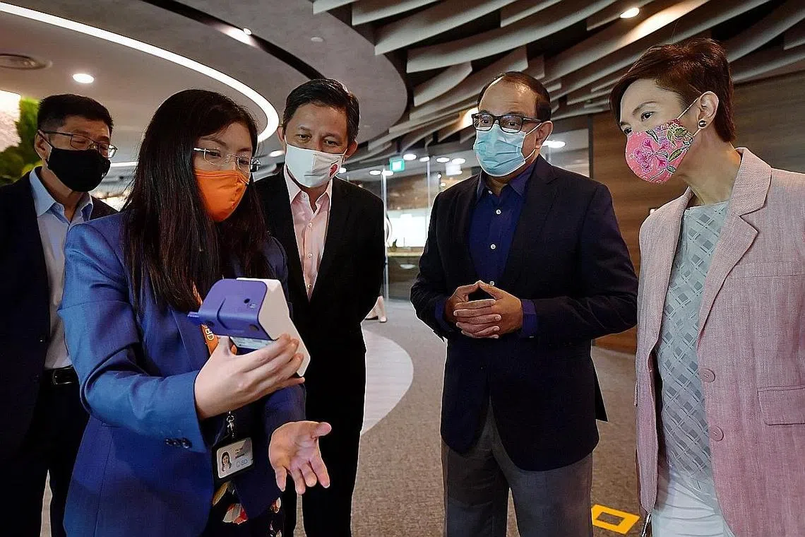 DIBERI TAKLIMAT: (Dari kanan) Cik Josephine Teo, Encik S. Iswaran dan Encik Chan Chun Sing diberi taklimat semasa lawatan mereka ke Becton Dickinson Asia Pasifik semalam. - Foto BH oleh NG SOR LUAN -