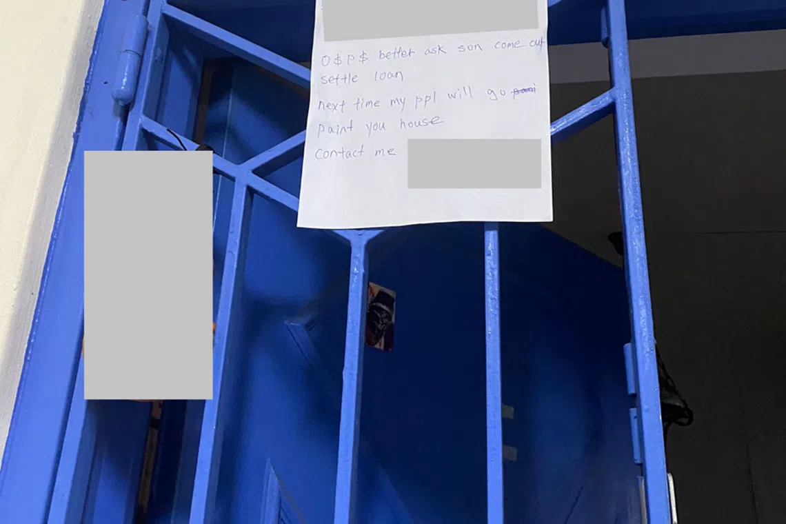 Dalam laporan itu, sebuah unit rumah di Woodlands Street 82 ditampal dengan nota penghutang pada jeriji utamanya.