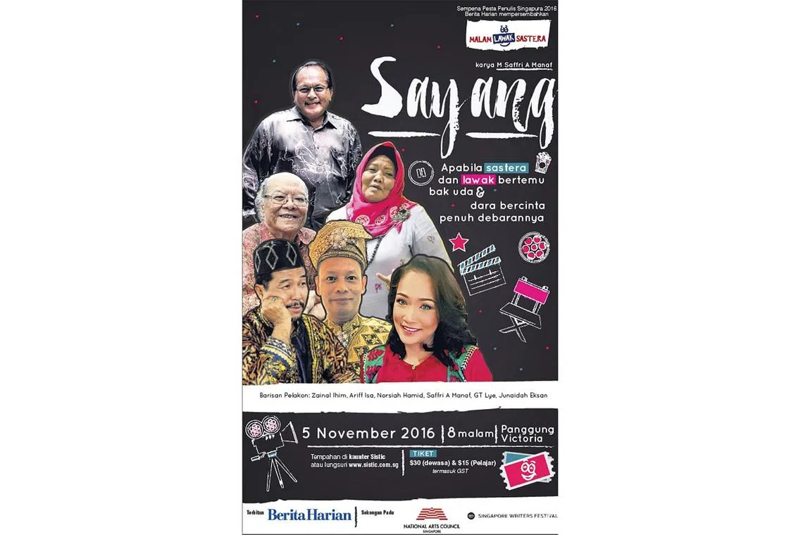 Malam Lawak Sastera yang dipentaskan sempena Pesta Penulis Singapura 2016 menampilkan naskhah Sayang di Sayang tulisan penulis mapan, M. Saffri A. Manaf, dan dijayakan oleh beliau sendiri, GT Lye, Norsiah Hamid, Junaidah Eksan, Ariff Esa dan Zainal Ihim.
