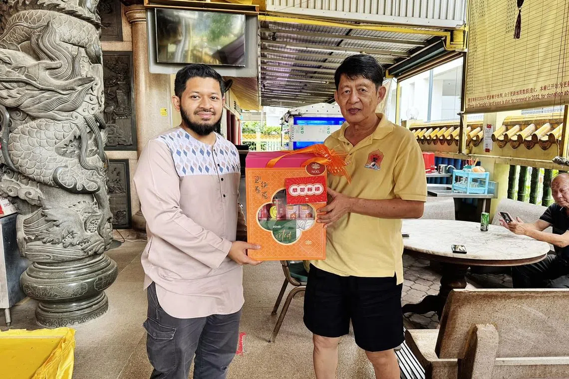 Pegawai agama masjid (MRO) Masjid Al-Islah, Ustaz Uwais Al-Qarni Mohamed Fawzi (kiri), memberi hamper kepada kakitangan kuil Sheng Jia sempena Tahun Baru Cina.