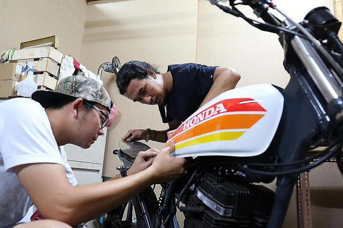 'HIDUPKAN' KEMBALI MOTOSIKAL KLASIK: Encik Loh (kiri) dan Encik Rusydi sedang memasang tangki minyak motosikal yang telah mereka ubah suai agar kelihatan lebih 'old school'. - Foto-foto FAKHRURADZI ISMAIL -