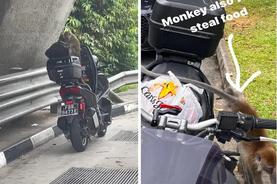 JADI SASARAN: Seekor monyet membongkar kotak motosikal ketika pasangan Cik Khansa Khairunnisa dan Encik Mohammad Danial Habibie sedang berteduh di bawah jambatan di BKE pada Ogos lalu (kiri) dan satu lagi kejadian motosikal itu diserang monyet ketika Encik Danial mengendali tempahan Grabfood (kanan). - Foto KHANSA KHAIRUNNISA