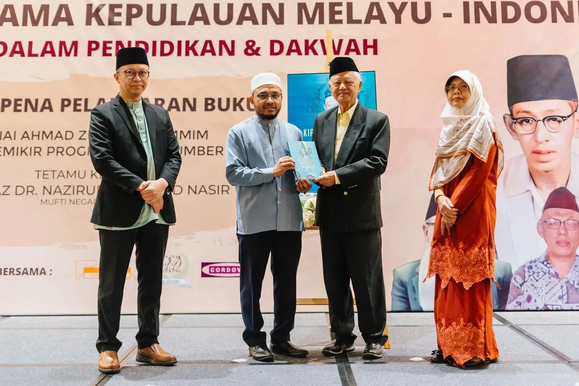 RAKAM BIOGRAFI: (Dari kiri) Pengarah Eksekutif Andalus Corporation Pte Ltd, Ustaz Fathurrahman M Dawoed; Mufti Dr Nazirudin Mohd Nasir; Pengerusi Al-Zuhri, Encik Wan Hussin Zoohri; dan Cik Sundusia Rosdi melancarkan buku biografi Kyai Ahmad Zuhri Mutammim di  Seminar Ulama Kepulauan Melayu-Indonesia pada Sabtu.