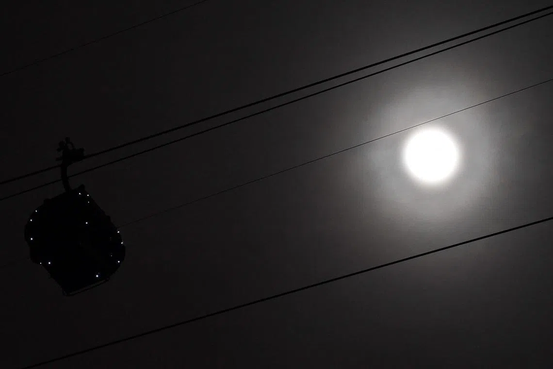 BULAN penuh kelihatan mengambang terang di sebelah kereta kabel di Sentosa malam kelmarin.