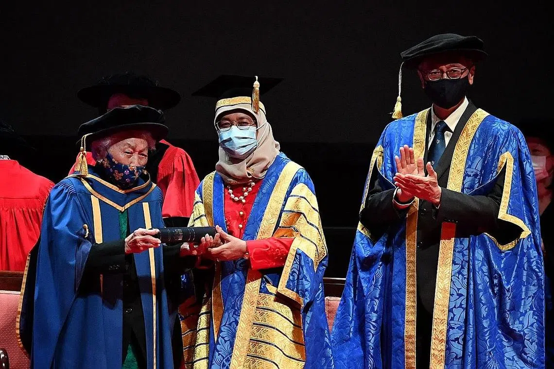 Semalam, wanita berusia 104 tahun itu, menerima ijazah kehormatan Doktor Persuratan yang disampaikan oleh Presiden Halimah Yacob, yang juga Canselor NUS, dalam satu upacara di Pusat Kebudayaan Universiti di Kampus NUS Kent Ridge.