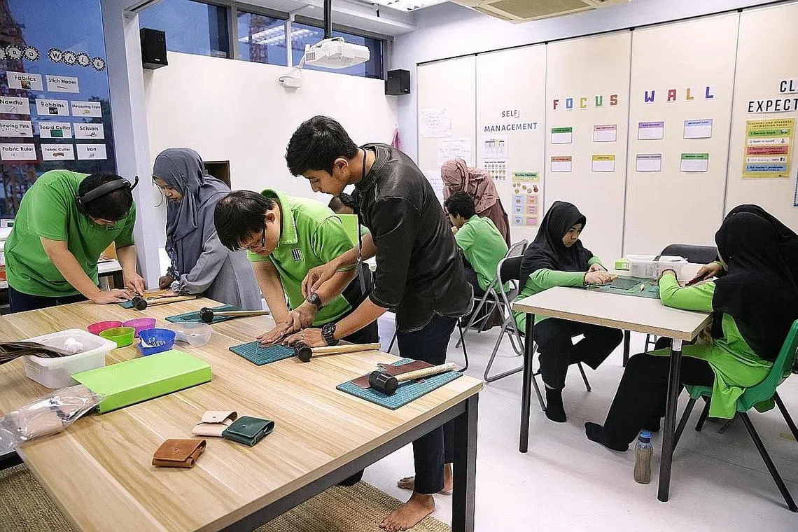 BUNYI tukul penebuk kulit yang mahu dijadikan kraf tangan seperti beg duit dan penanda buku mengisi ruang sebuah bilik darjah hab pendidikan khas di Changi Road.