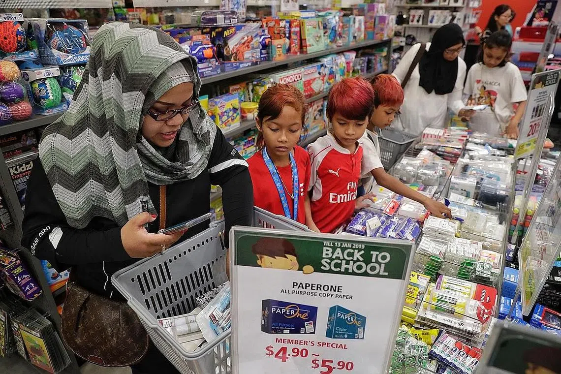 HULURKAN BANTUAN: Pengasas Project Goodwill Aid, Cik Siti Nurani Mohd Salim (kiri), dan sukarelawan Cik Sufiyyah Ithnin (dua dari kanan), membeli peralatan sekolah bagi pelajar dari keluarga memerlukan. (dari kiri) Puteri Nurinsyirah Abdullah, 11 tahun; Muhammad Syaffiq Yusri, 10 tahun; Muhammad Sofiyan Shah Yusri, lapan tahun; dan Rabeeatul Adawiyah Edros, sembilan tahun di Tiong Bahru Plaza. - Foto BH oleh KEVIN LIM -