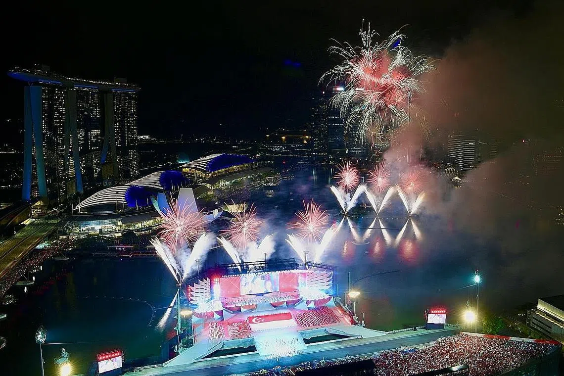 GEMERLAPAN CAHAYA: Lautan merah dan putih warga menyaksikan Perbarisan Hari Kebangsaan (NDP) tahun ini di Pentas Terapung Marina Bay. - Foto-foto BH oleh DESMOND FOO, LIM YAOHUI -