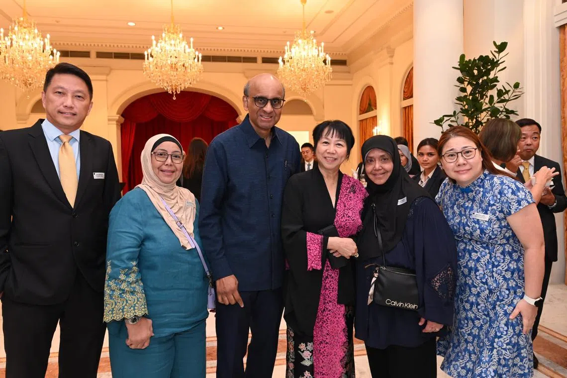 SOKONGAN AKTIF: Cik Narimah Abdul Rahim Bajerai (dua dari kanan) dan Cik Sheafa Abdul Rahim Bajerai (dua dari kiri) bergambar bersama Presiden Tharman Shanmugaratnam (tiga dari kiri) dan isterinya, Cik Jane Ittogi Shanmugaratnam (tiga dari kanan), serta pegawai agensi perkhidmatan sosial, Able, semasa acara Malam Penghargaan Cabaran Presiden 2023 di Istana baru-baru ini. Able adalah antara 86 agensi yang meraih manfaat daripada Cabaran Presiden. - Foto CABARAN PRESIDEN