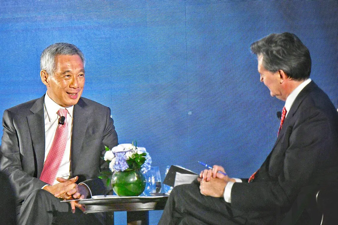BINCANG ISU SERANTAU: Encik Lee menjawab beberapa soalan yang dikemukakan hadirin di dialog semasa jamuan malam sempena Forum Ekonomi Baru Bloomberg. Moderator dialog itu adalah ketua editor Bloomberg News John Micklethwait (kanan). - Foto BH oleh ARIFFIN JAMAR -